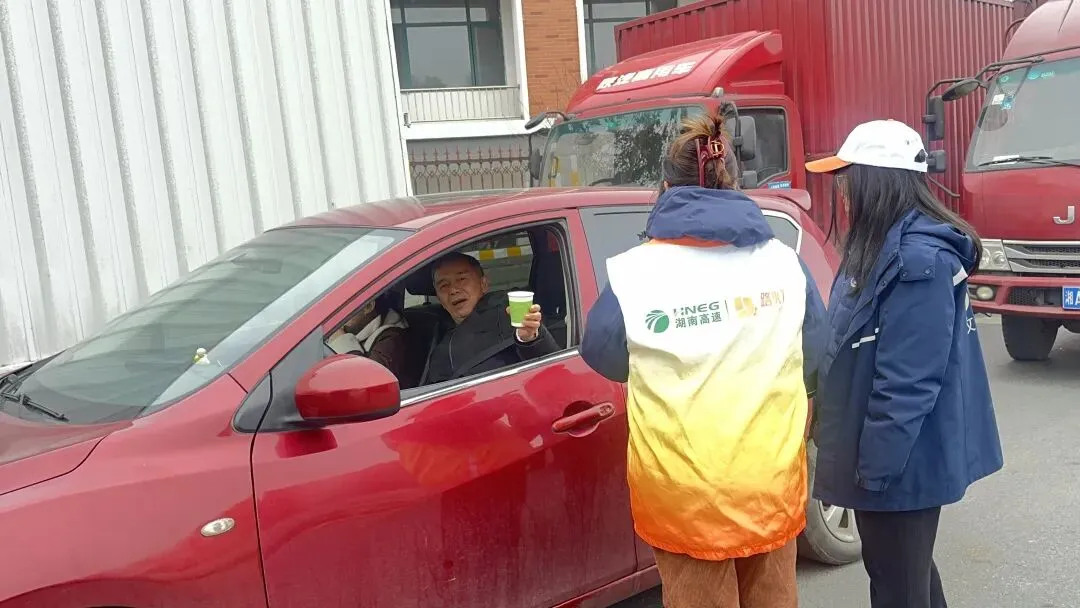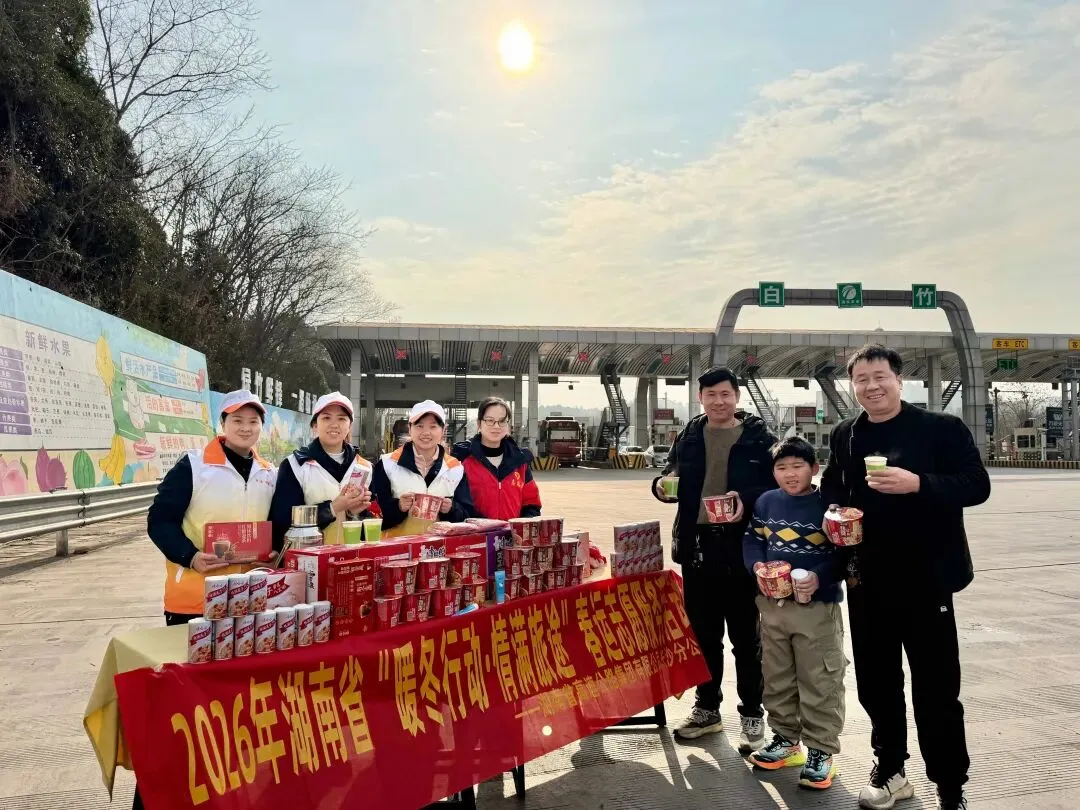 “师傅,一路辛苦了,喝杯热茶解解乏、暖暖身!观音岩中心站以暖心举措全力护航群众平安返乡。活动现场,收费站“路灯”志愿者们暖意满满,为过往司乘免费提供热水、姜茶、方便面等便民物资,同步开展路况引导、应急帮扶等志愿服务,并积极推广已在全省收费站全面覆盖的 “三湘畅行” 平台。志愿者现场手把手引导返乡车主提前预约、录入车牌,实现无卡支付,不仅助力司乘避开拥堵、稳驾慢行,更让每台车过站时间平均缩短 15 秒。智慧服务搭配贴心志愿,切实提升司乘出行体验,让2026年的春运归途更有温度。