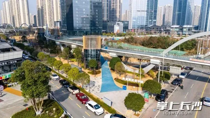 据介绍,梅溪湖中轴线东段空中廊桥东起城市岛,全长约450米,路面宽4.5米,跨越环湖路、五洲路和梅溪湖路,采用地面景观、人行廊桥与地下空间一体化设计。今后,市民可从城市岛标志性双螺旋观景平台出发,经空中廊桥穿过中轴线东段,衔接慢行系统的两座廊桥,实现与沿线商业、住宅及公共空间的无缝穿行,彻底打通慢行交通“断点”,日常出行与休闲漫步的便利性大幅提升。