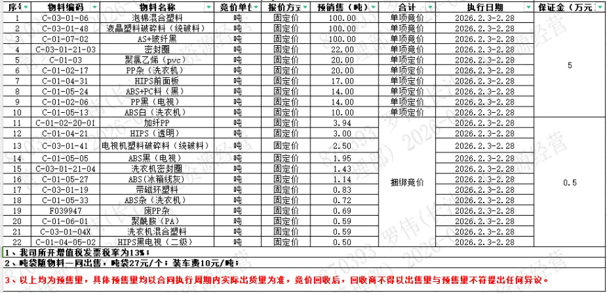 拟对以下物料价格进行竞价,下表中出售量仅供参考,最终数据以我司出售时过磅数量为准。竞价回收后,回收商不得以出售量与预估量不符提出任何异议,按量销售物短装或溢装比例不超单个合同量的5%。