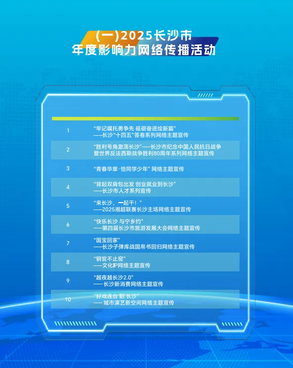 以《“来长沙,一起干!”——2025湘超联赛长沙主场网络主题宣传》为代表的2025长沙市年度影响力网络传播活动,深度聚焦城市发展,生动诠释城市精神,助力长沙持续占据网络C位;