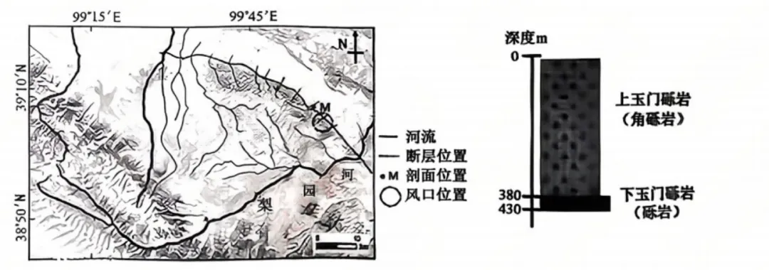 ①地壳抬升,河流下切形成风口古河道②古梨园河稳定流经,形成下玉门砾岩