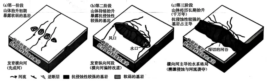 ①横向河到纵向河是原因:横向河下切打破硬岩层时,难以继续下切,能量转而消耗于侧向改道,横向河演变为纵向河。