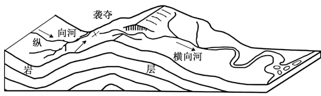 A.纵向河袭夺横向河B.纵向河流向与谷地走向垂直