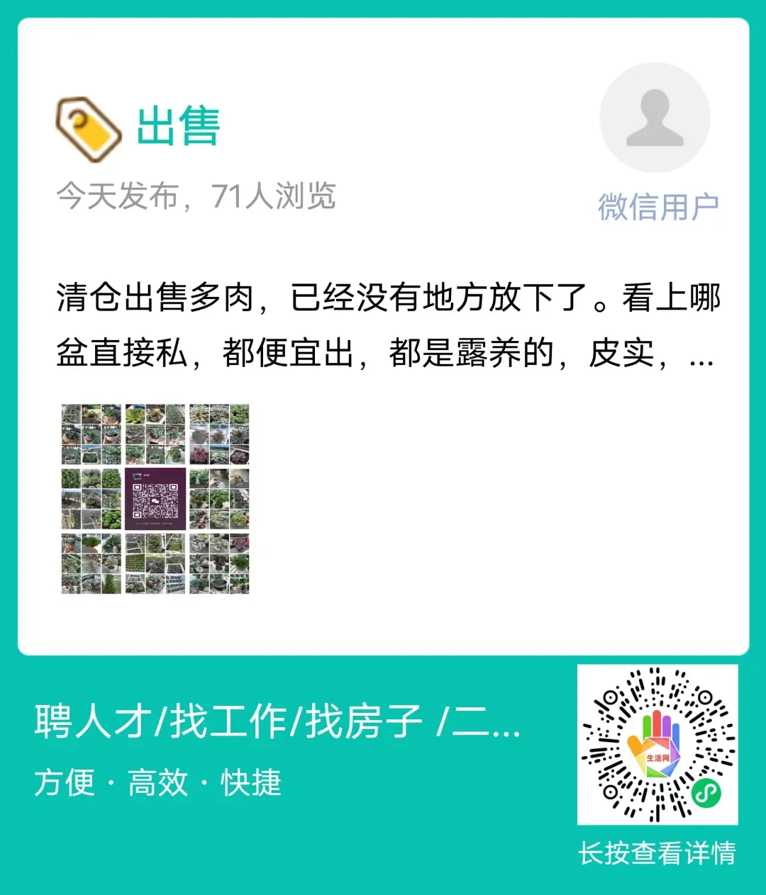 清仓出售多肉,已经没有地方放下了。看上哪盆直接私,都便宜出,都是露养的,皮实,好养。可以上门来挑,要的多市区也可以给你送过去,大小不一样,价格也不一样。
