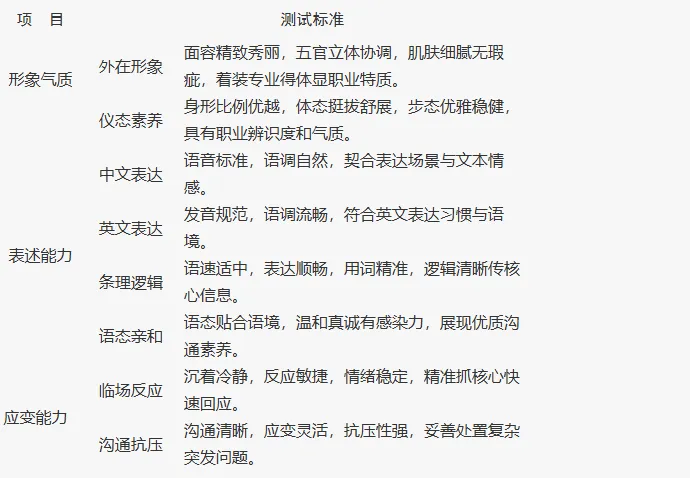 2.专项测试内容:专项测试分为形象气质、表述能力、应变能力三部分。形象气质主要考查考生外在形象和仪态素养是否复核专业要求。表述能力重点考查考生中、英文表达的逻辑性、流畅度与亲和力。应变能力重点考查考生在压力情境下的临场反应、思维敏捷性及心理稳定性。
