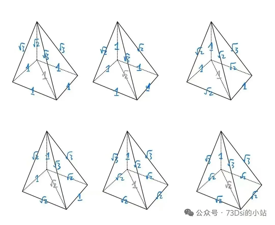 第三境界:登堂入室——发现其中一种四棱锥5条棱长为1,3条棱长为根号2,不符合条件,所以一共6(或8)种情况;