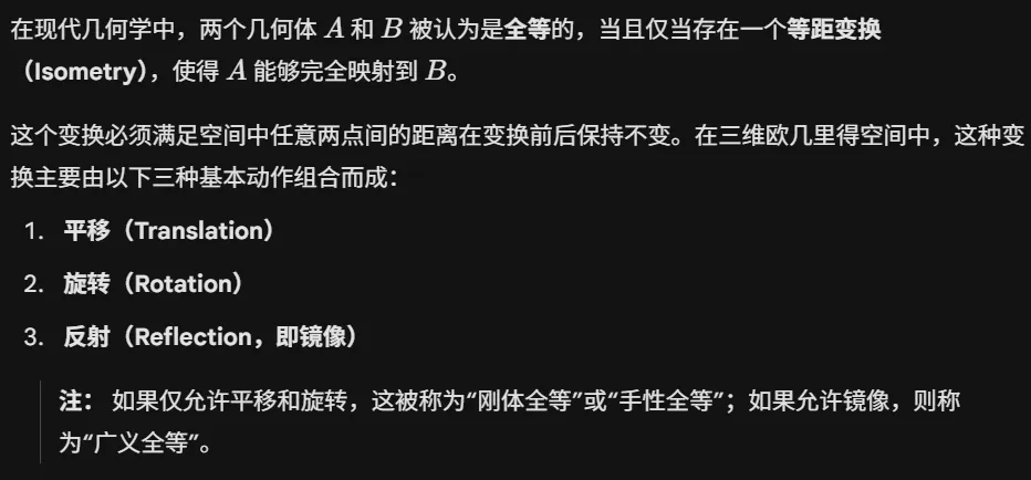 那么当前数学届,是如何“解决”这个问题的呢?他们采用了如下定义:将能够通过平移、旋转、反射变换和彼此重叠两个几何体,定义为全等的。在这个定义下,这题答案毫无疑问,是6个。