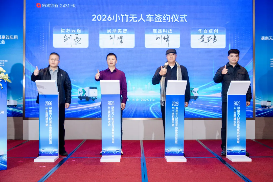 随后举行的签约仪式上,智芯云途与润泽美智、瑾鑫科技、华自卓创三家企业现场签署合作协议,将围绕无人配送车在区域市场的推广与应用开展深度合作,共同提升末端物流的服务效能。