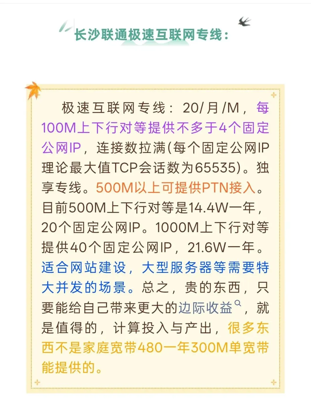 上行100M,下行1000M vs 上行100M,下行100M巅峰对决。 长沙联通不对等的固定公网IP商务专线:上行100M,下行1000M,固定公网IP1个:8179一年,含2.5G网口+WIFI7的高配企业网关。 长沙联通极速互联网专线100M版本:上行100M,下行100M。固定公网IP4个。底价20/月/M,也就是24000一年。含企业网关。 在企业宽带中除了公网IP的动态/固定以外,还有一个重要的参数就是TCP会话数。8179元一年的套餐用户压测可达到4万多会话数,理论值65535;而24000一年上下行对等100M的极速互联网专线理论上可以达到65535*4的会话数。对于需要大量并发连接的企业来说,这是一个不容忽视的差异。 最后是接入层级和网络质量的问题。上行100M、下行1000M的套餐采用二级分光线路;而极速互联网专线上行100M、下行100M的专线则提供一级分光以上的独享专线,高速率可申请PTN接入,不走城域网以降低延迟。实际上,8179一年上行100M,下行1000M的云网融合+固定公网IP并不存在速度测不到那么多的情况或带宽不够用的问题;关键在于互联网专线主打的是安全性和高TCP会话数的需求满足建网站、服务器和大型企业特大带机量的需求,并运营商提供24小时值班处理故障的服务。因此,在办理企业宽带时不能只看表面的数值对比。性价比是在你看不到的地方有所减配。 企业宽带也分三六九等, 因此,这是两个不同体系的产品之间的较量。假设上行100,下行1000M的企业宽带也给一级分光以上,或者PTN加入,也给4个公网IP。24H值班,2小时故障响应。那么你就不需要纠结它是否对等了,同产品当然选下行快的。(所以某运营商就是喜欢玩上下行对等的梗,让不懂的小白内个。) 结论:当你是小型企业,设备数量很少,吃不满1个公网IP的TCP会话数,以及没有高安全和管理需求的时候,也不需要低时延。你想,你做个文档几ms有啥区别。此时上行100M,下行1000M无论是价格还是体验都会吊打上下行对等100M的极速互联网专线。因为下行1000M十倍的下行速度摆在那里。但是对于大型企业来说,办公场景需要特大带机量和同时并发。避免设备接入了但是上不了网的问题,此时这种情况上下行100M对等的极速互联网专线又反而吊打商务专线上行100下行1000M含1个公网IP。THE COLD CURRENT WILL ARRIVE