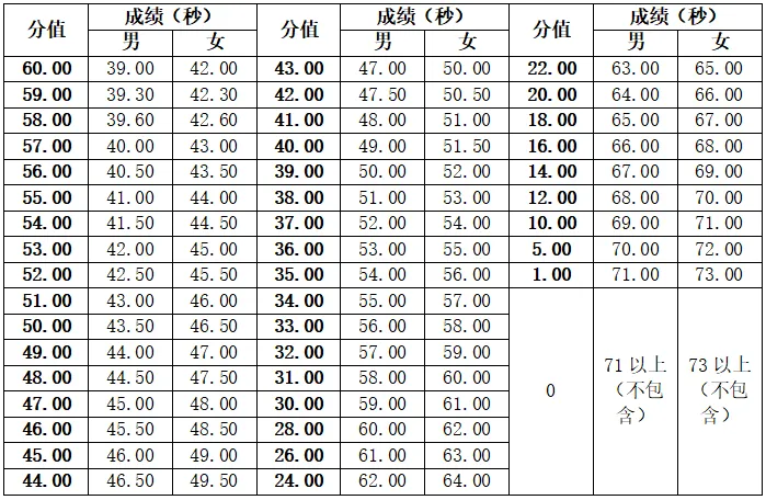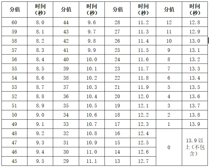 评分标准:中投,每投中1球,得4分,投中15球(含)以上为满分60分;三分球,每投中1球,得6分,投中10球(含)以上为满分60分。