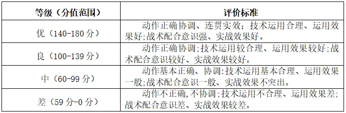 评分标准:考评员参照实战能力评分细则(表3),独立对考生动作的正确、协调、连贯程度,技、战术运用水平以及配合意识等方面进行综合评定。采用180分制评分,分数至多可到小数点后1位。