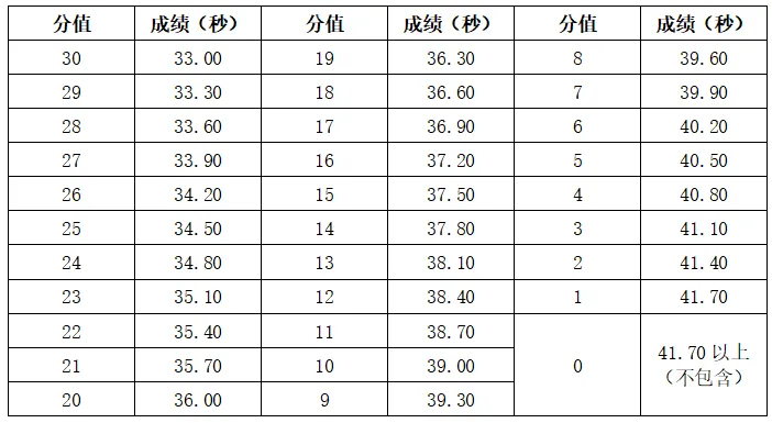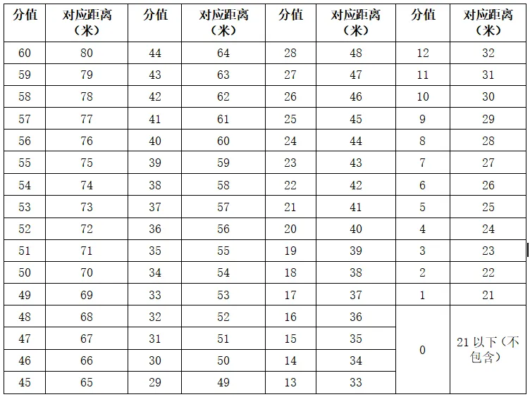 评分标准:以球从起点线踢出后,从空中落到地面的第一接触点为准,每将球传入目标区域的半圆内(含第一落点落在圆周线上),或七人制球门含球击中球门横梁或立柱弹出即得12分。每人须完成6次传准,取5次最好成绩,满分60分。