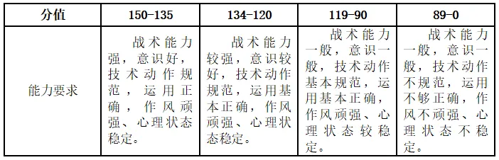 评分标准:考评员参照实战能力评分细则(表14),独立对考生的技术动作规范、协调程度,运用效果,战术意识以及个人实战能力等方面进行综合评定。采用210分制评分,分数至多可到小数点后1位。