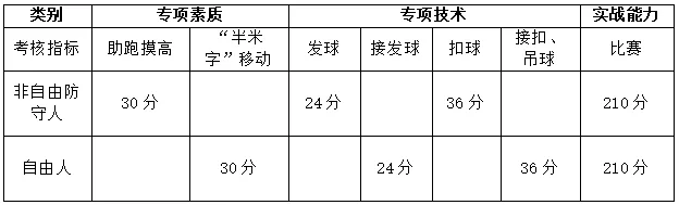 a立定跳远(30分),掷远与踢远(60分),扑接球(60分),实战—比赛(150分)。