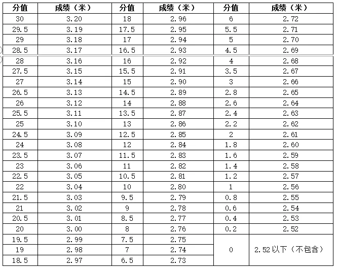考生助跑双脚起跳摸高,单手触摸电子摸高器或有固定标尺的高物,记下绝对高度。每人2次摸高机会,记其中1次最高成绩(精确到厘米)。