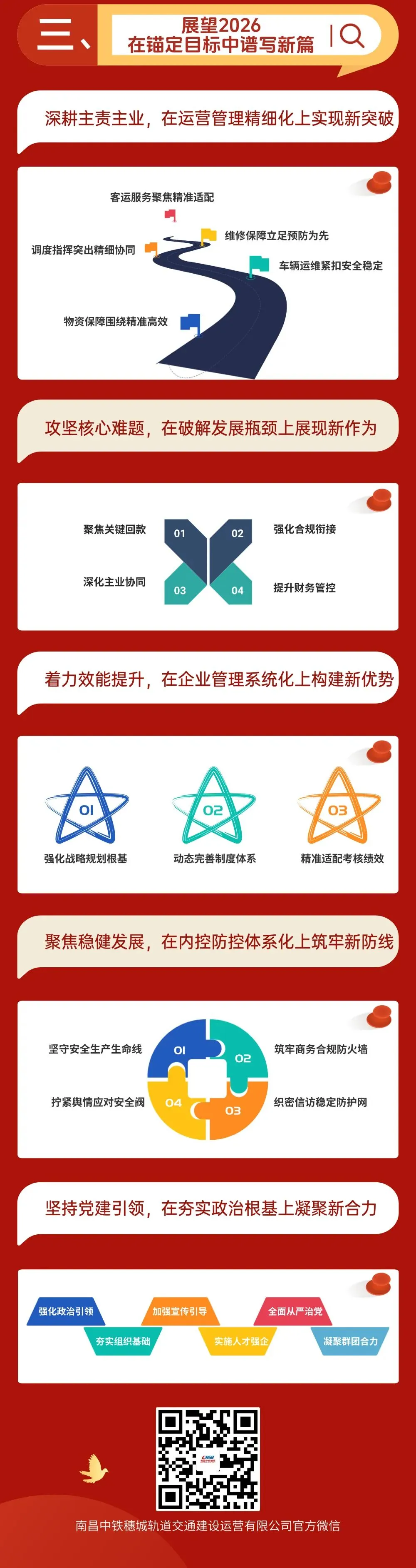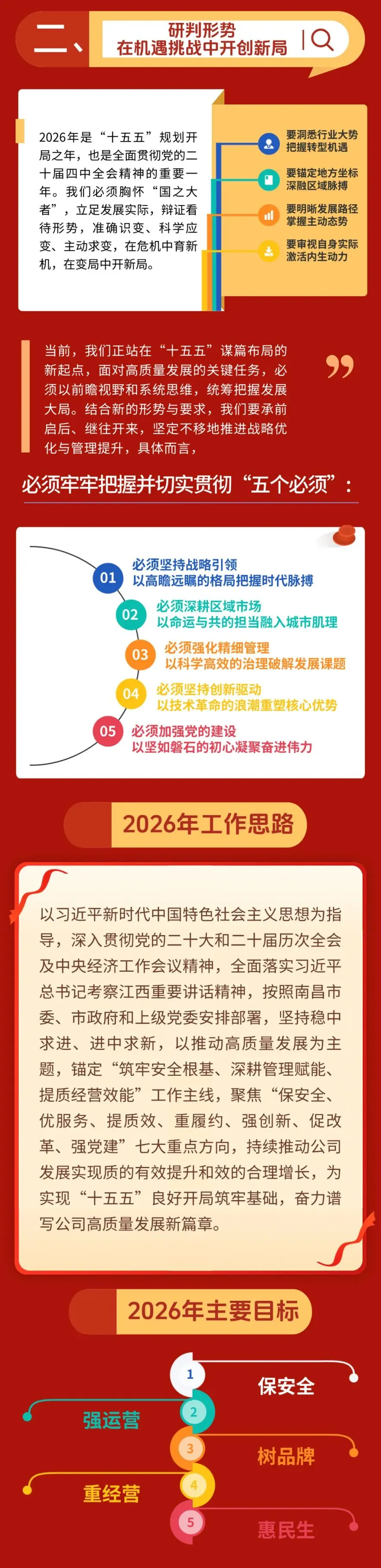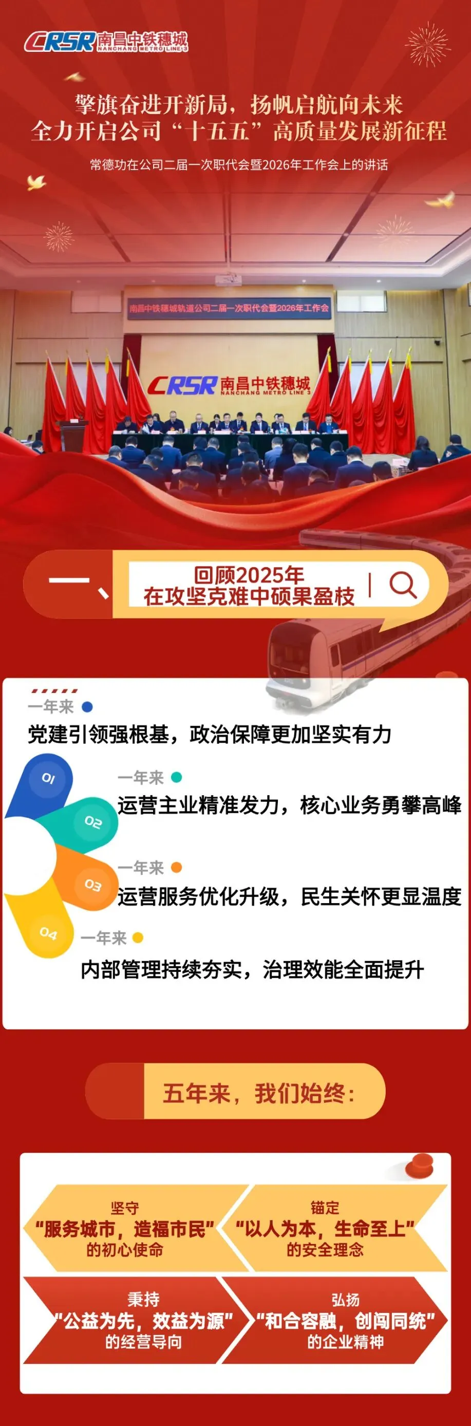 2月3日,南昌中铁穗城轨道交通建设运营有限公司在莲塘车辆段召开二届一次职代会暨2026年工作会。党委书记、董事长常德功作了题为《擎旗奋进开新局 扬帆启航向未来 全力开启公司“十五五”高质量发展新征程》的讲话,对公司2025年、“十四五”期间重点工作进行了回顾,分析研判了形势任务,明确了做好2026年工作总的要求。让我们一起看看讲话中的要点吧。