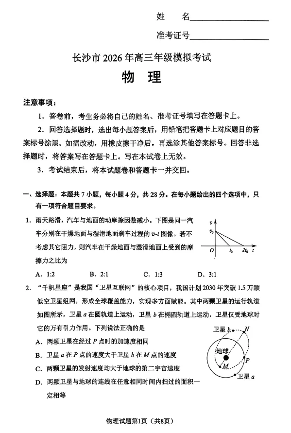 湖南省长沙市2026年高三年级模拟考试(长沙一模)(2.1-2.3)物理/化学/历史试卷及答案