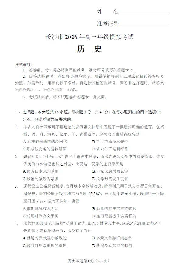 当前位置:首页>长沙>湖南省长沙市2026年高三年级模拟考试(长沙一模)(2.1-2.3)物理/化学/历史试卷及答案