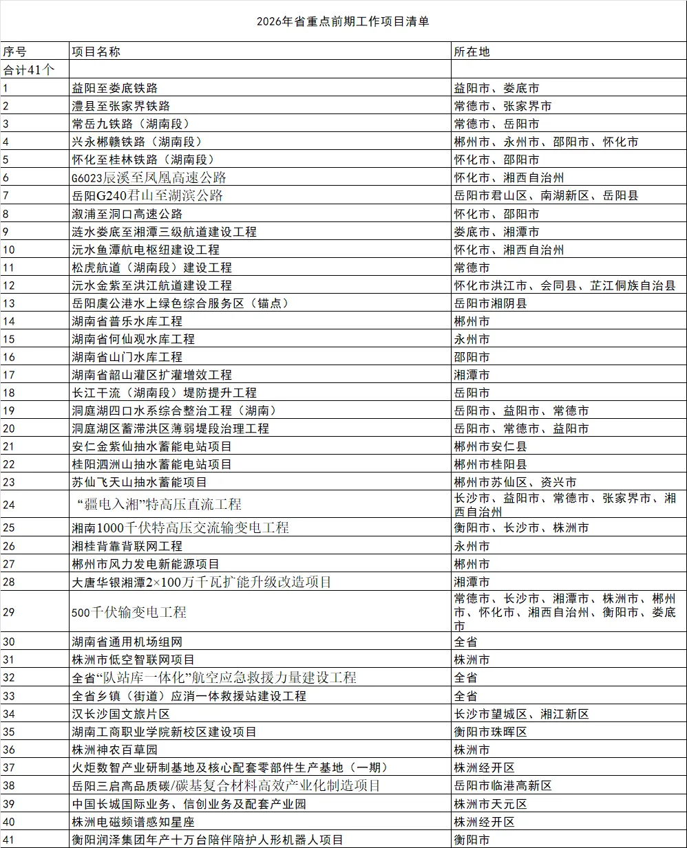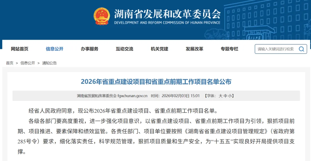 2026年2月3日,湖南省发改委公布了"2026年省重点建设项目和省重点前期工作