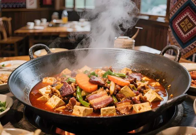 中午去尝三下锅。腊肉、豆腐、萝卜干一锅炖,油亮亮的,下饭贼香。当地人吃饭不讲究摆盘,一句"再添点",就是热情。