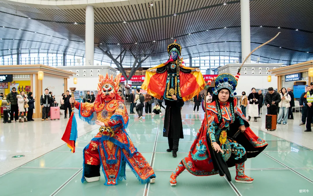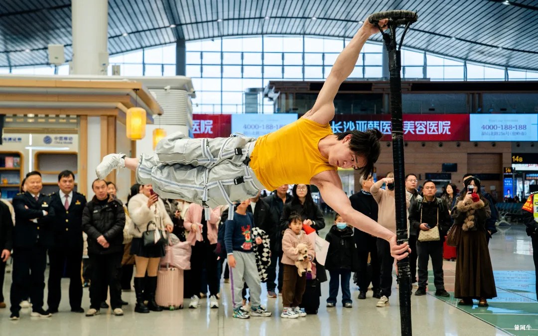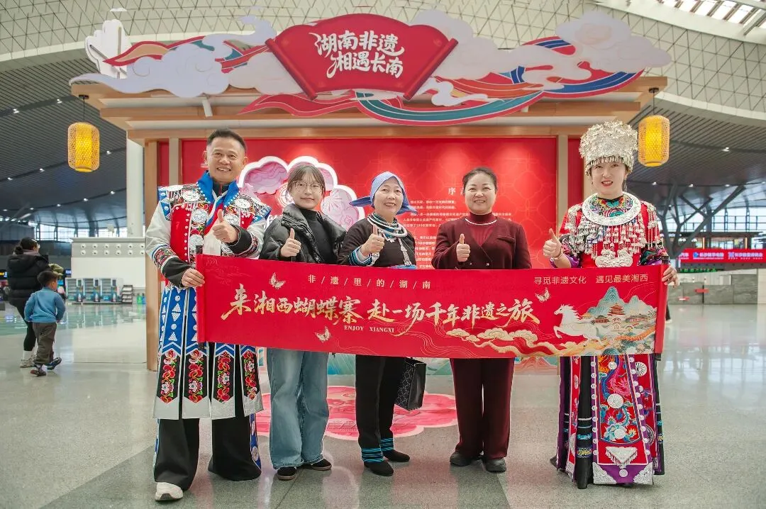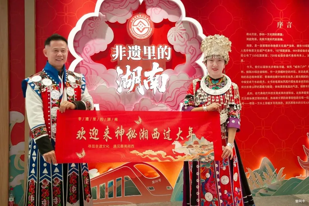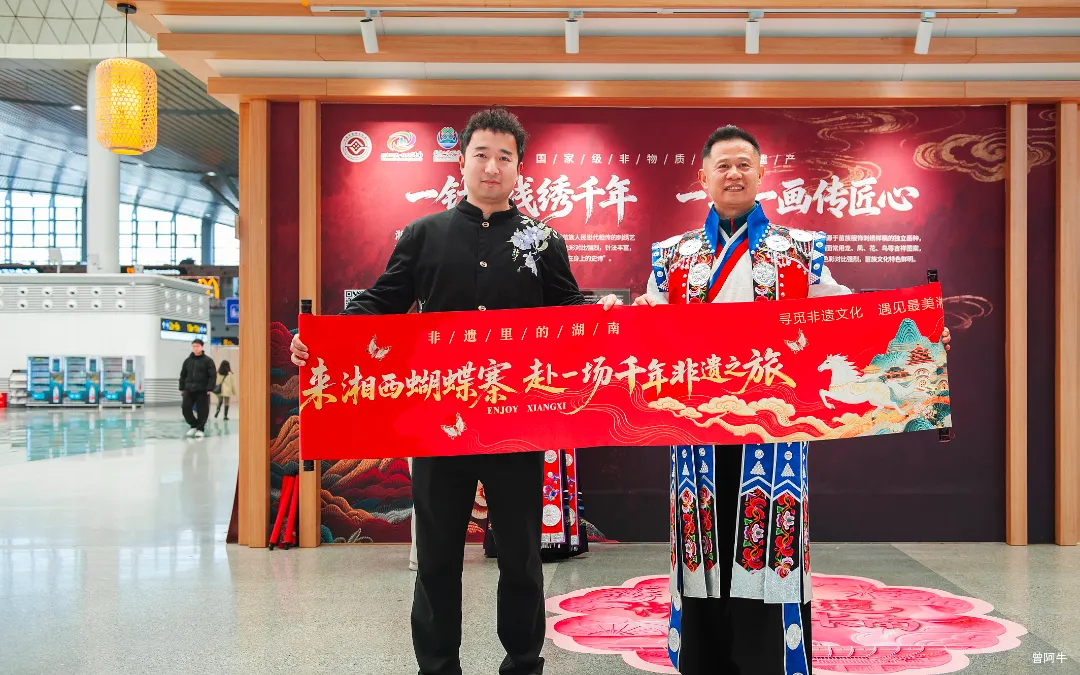 更触动我的,是他们落落大方地展开卷轴,向旅客发出邀请:“欢迎来神秘湘西过大年”“来湘西蝴蝶寨,赴一场千年非遗之旅”。言语道白间满是热情,将苗绣展示与本地文旅推介无缝衔接。