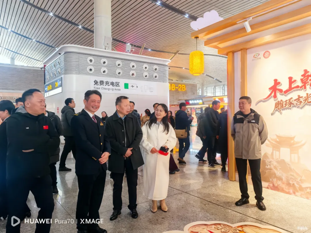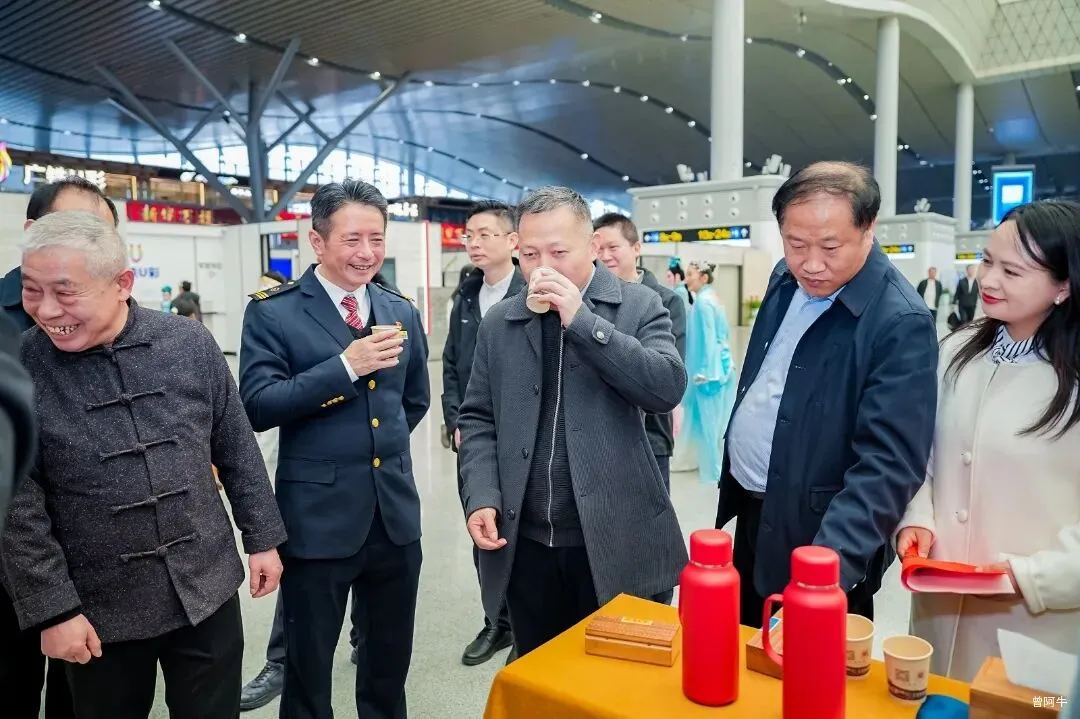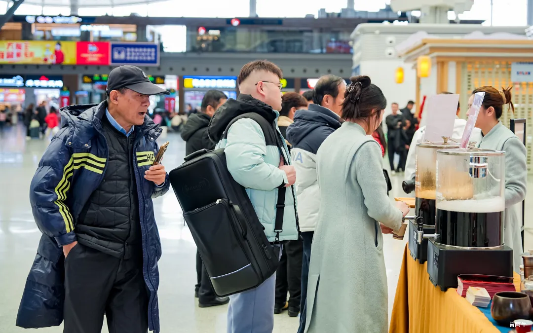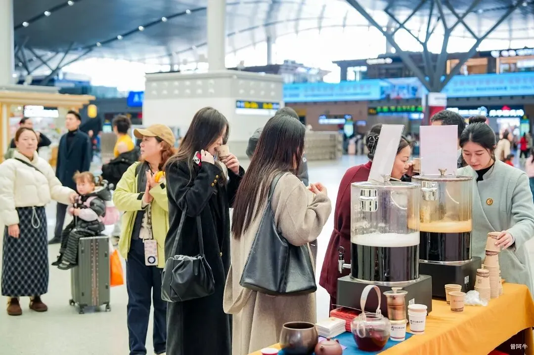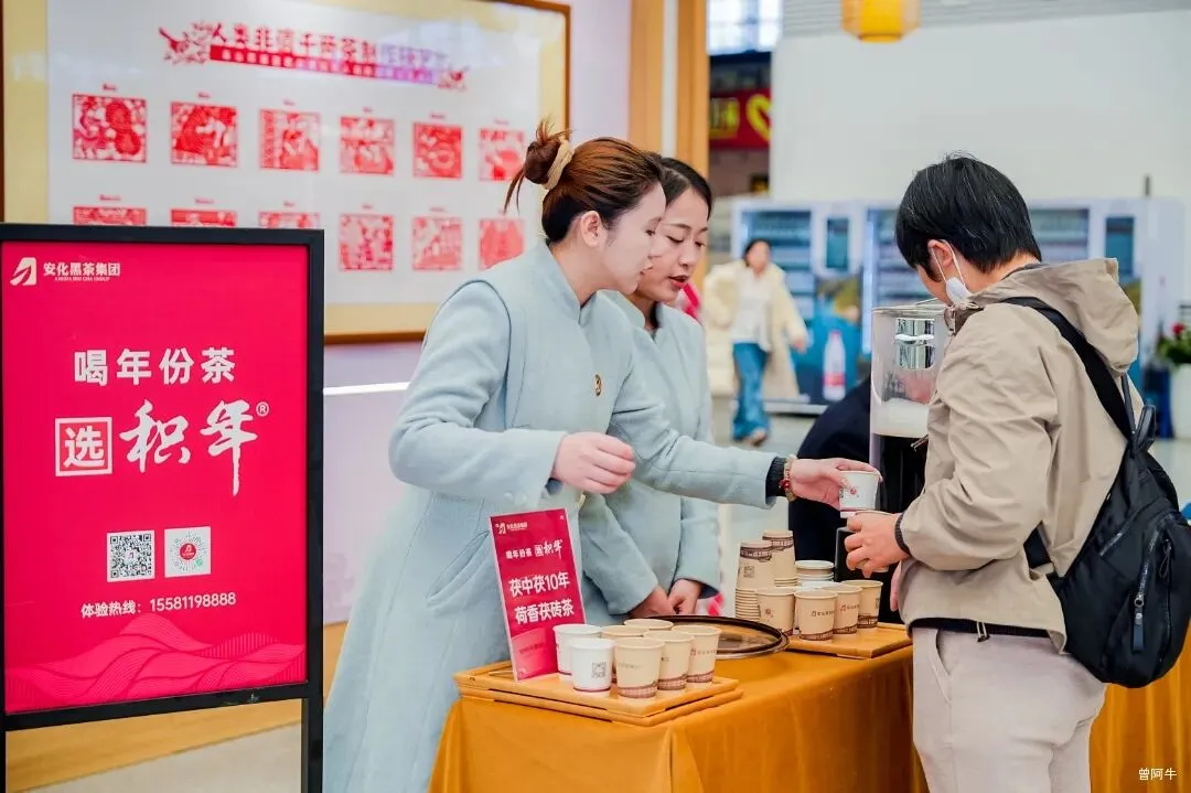 她们一边为过往旅客表演茶艺,一边轻声讲解安化黑茶的历史渊源、制作工艺与冲泡技巧,随后,将一杯杯温热的黑茶双手递到旅客手中,轻声道一句“请喝茶”,暖意瞬间从指尖传到心底。旅客们接过茶水,细细品尝,与茶艺师亲切交流,在欢声笑语中,安化的文化底蕴与文旅特色,便深深印在了每一位旅客的心中。