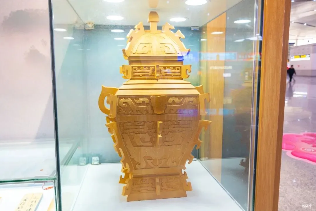 当那件竹刻“皿方罍”映入眼帘时,我心头一震,“谁家的猪拱我家的白菜”差点脱口而出,继而涌起复杂的惭愧之情。邵阳宝庆竹刻的艺人以精湛的技艺,完美复刻了商代晚期出土于桃源、被誉为“方罍之王”的国宝重器。器型庄重典雅,纹路繁复精美,边角打磨得光滑细腻,凑近细看,甚至能看到竹丝的肌理,堪称竹刻艺术的精品。
