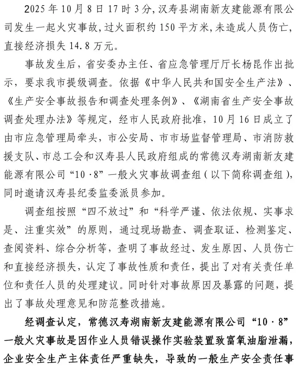 2025年10月8日17时3分,汉寿县湖南新友建能源有限公司发生一起火灾事故,过火面积约150平方米,未造成人员伤亡,直接经济损失14.8万元。