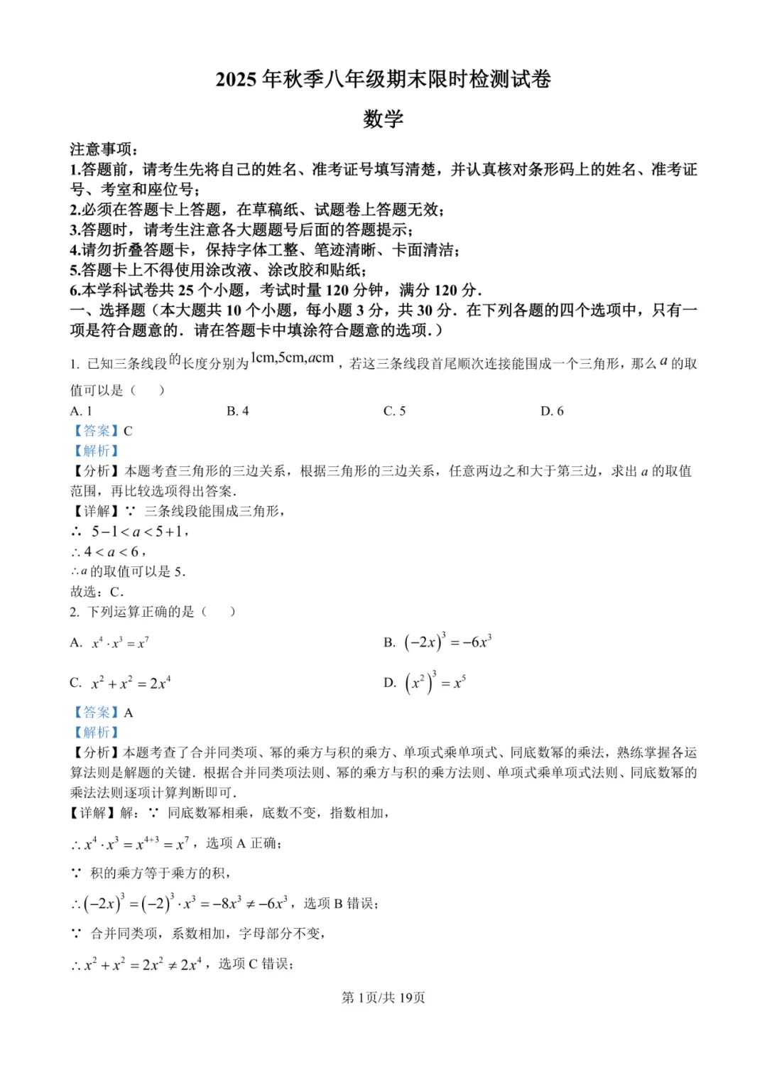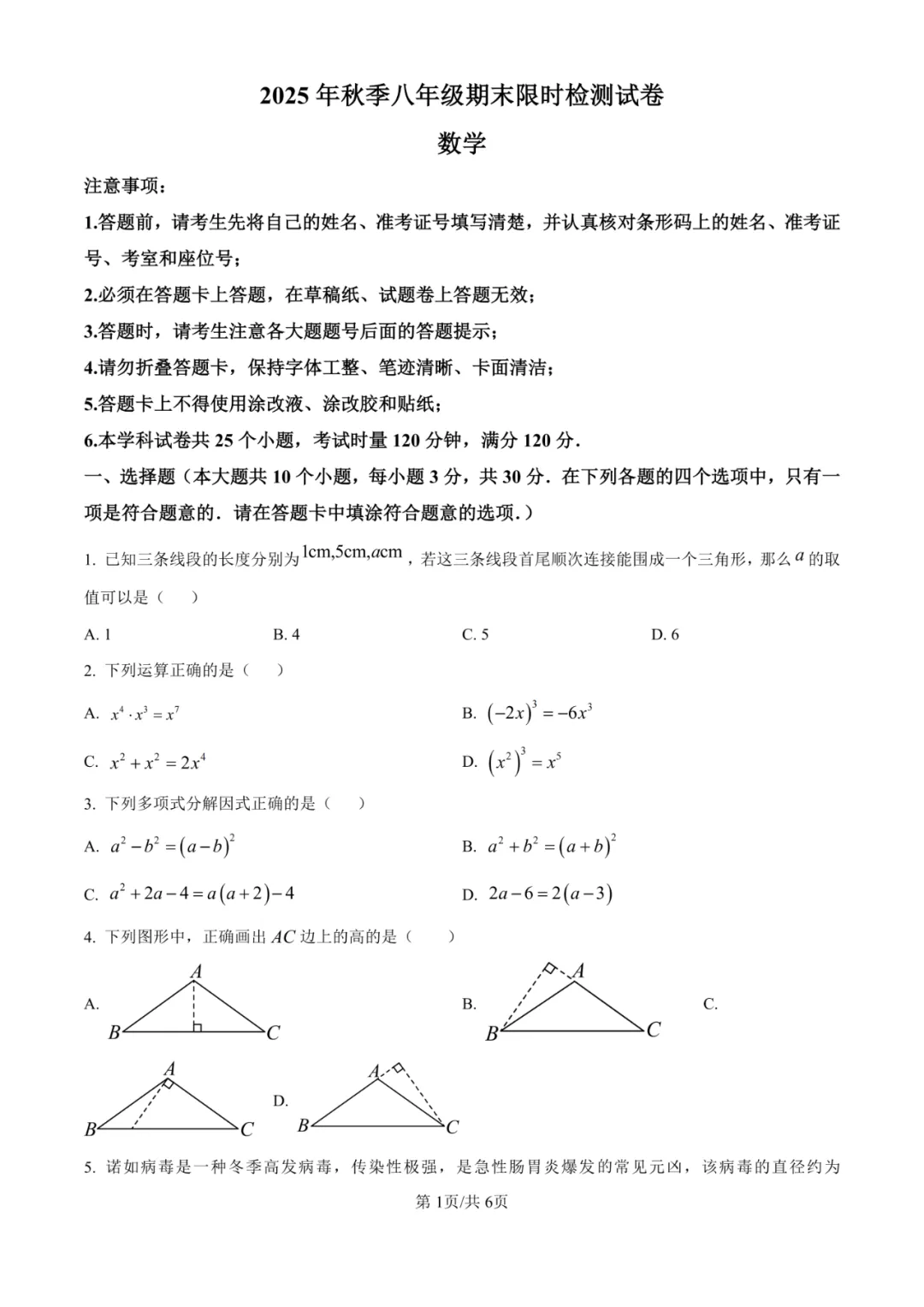 本试卷紧扣八年级数学课程标准,重点考查三角形性质、全等三角形判定、因式分解、分式运算等核心内容。得分点集中在基础运算和简单几何证明;难点在于第10题的最短路径问题和第25题的综合探究题,这类题目需要学生具备较强的空间想象能力和综合运用知识解决问题的能力,对学生的数学思维深度提出较高要求。