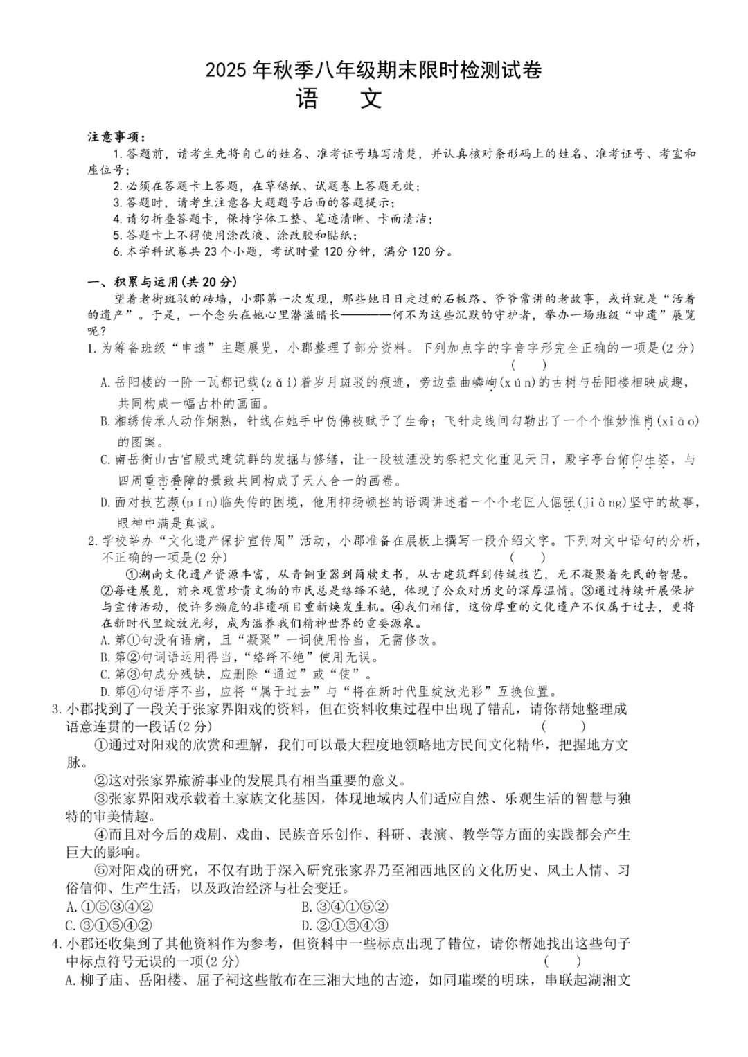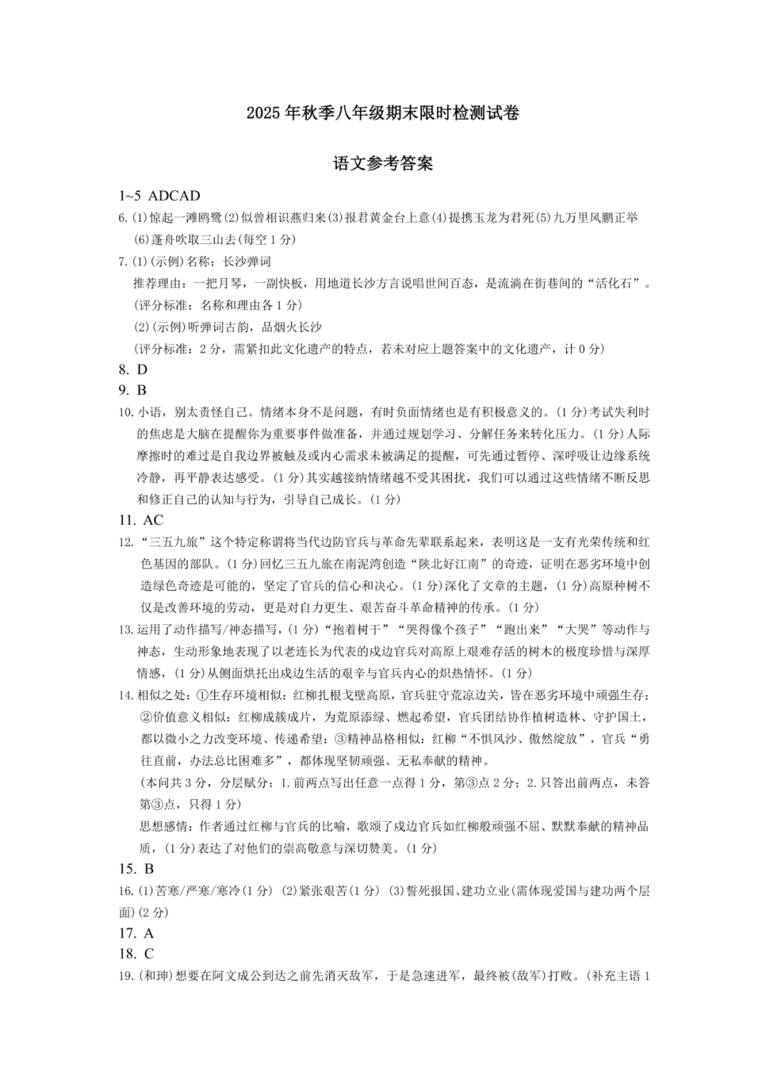 本试卷全面覆盖八年级语文课程标准要求,重点考查古诗文积累、现代文阅读、语言运用等核心能力。得分点集中在基础积累和语言运用题;难点在于《在高原种红柳》的深层意蕴理解和文言文《阿文成公用兵》的对比分析,这类题目需要学生具备较强的文本解读能力和文化理解深度,对学生的思维品质和情感体验提出较高要求。