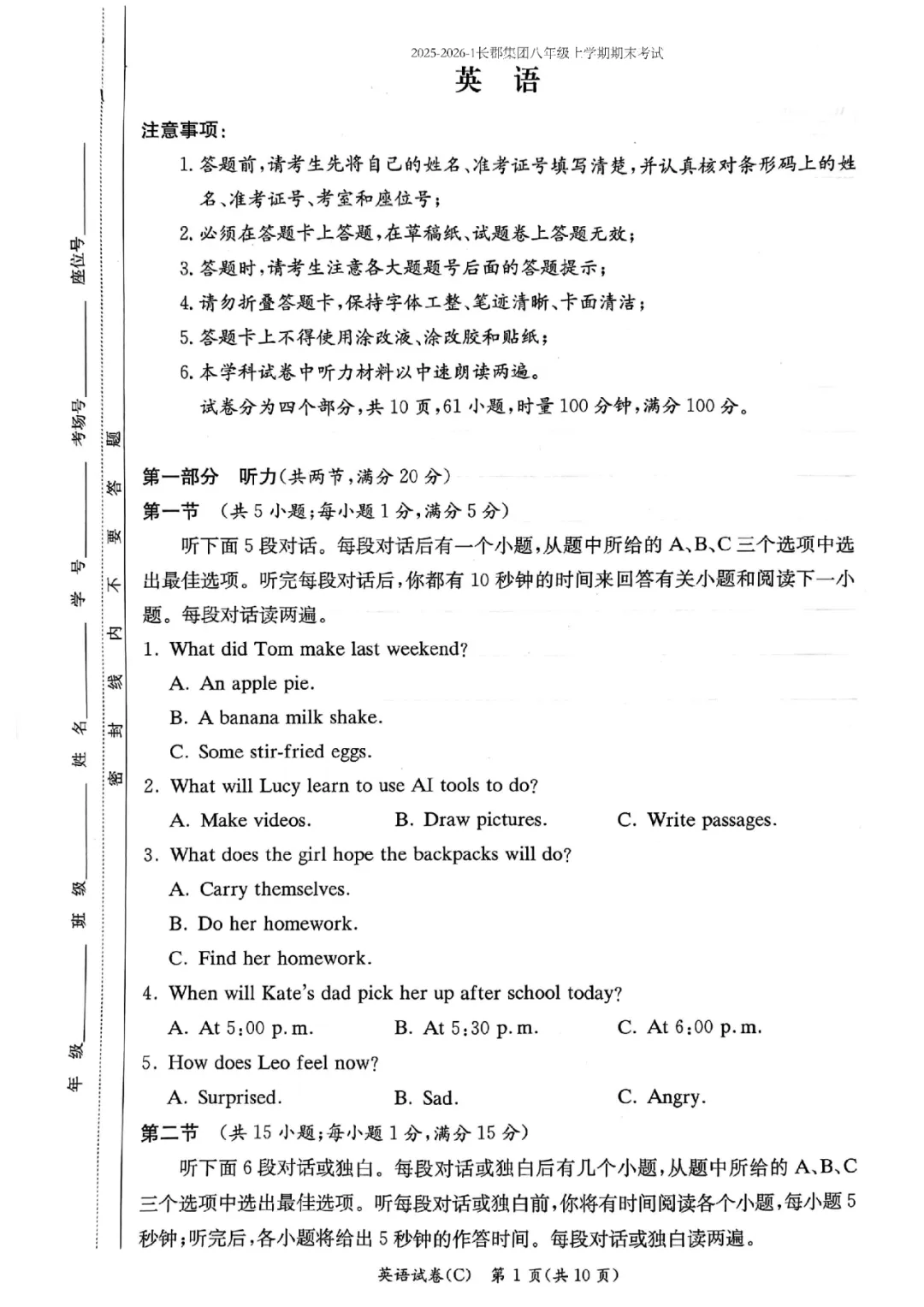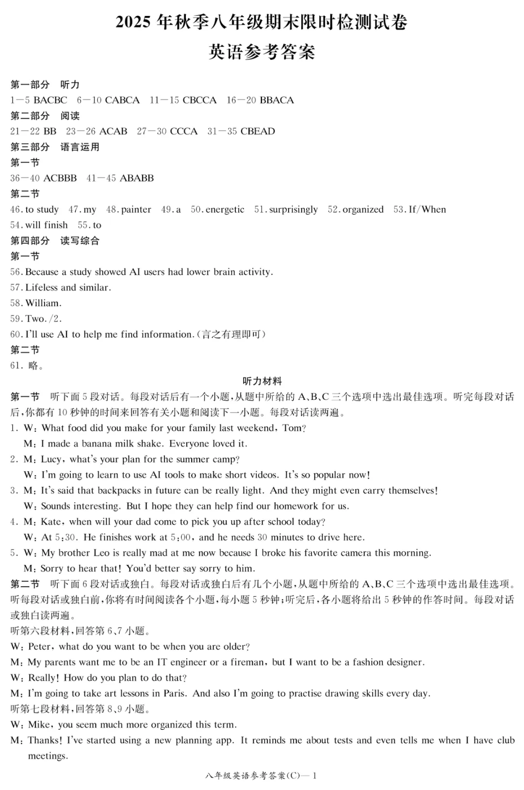 本试卷全面覆盖八年级英语核心素养,重点考查听力理解、阅读理解、语言运用和写作能力。得分点集中在基础语言知识和生活化情境对话;难点在于AI主题的议论文阅读和思维导图写作,这类题目需要学生具备较强的信息整合能力和逻辑表达能力,对学生的思维深度和语言组织能力提出较高要求。