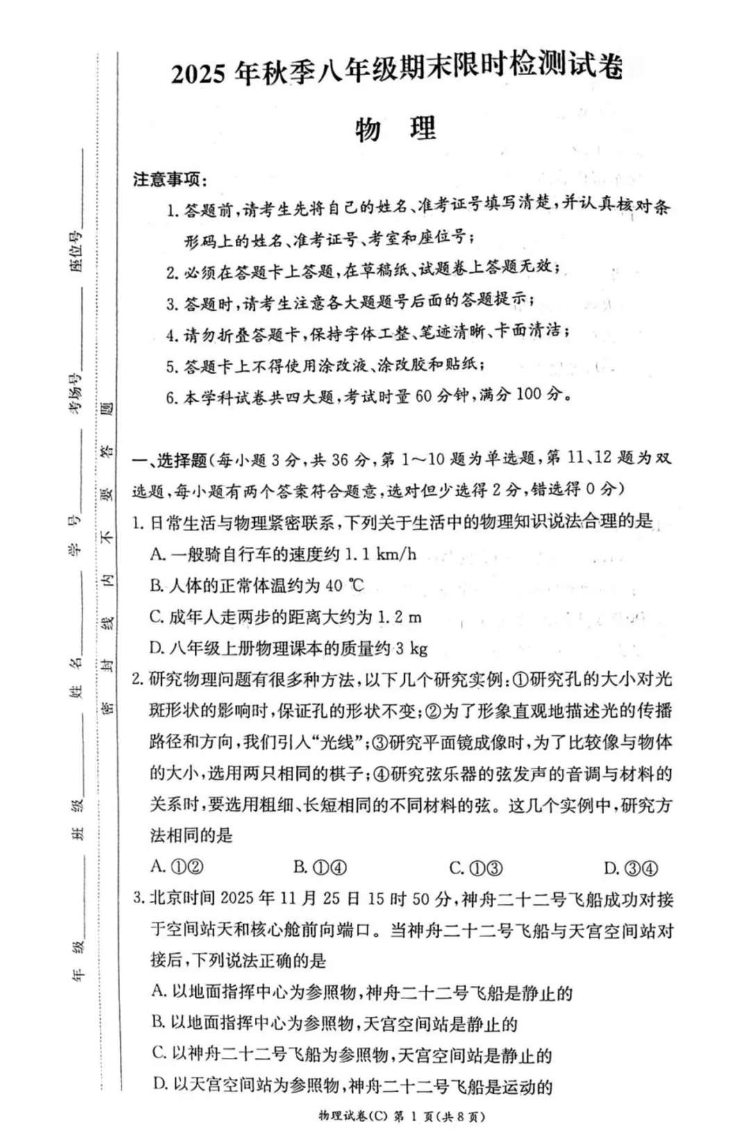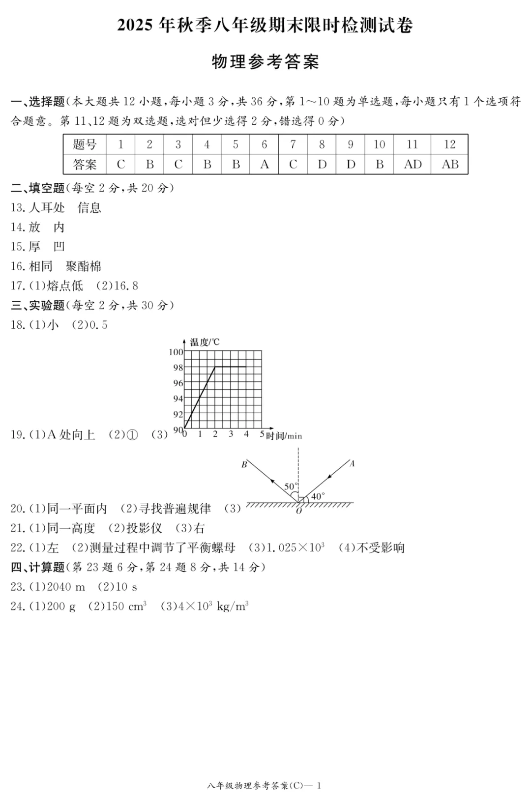 本试卷紧扣八年级物理课程标准,重点考查声现象、物态变化、光现象、质量与密度等核心内容。得分点集中在基础概念和实验操作题;难点在于第24题的密度计算和第12题的光学成像分析,这类题目需要学生具备较强的物理建模能力和综合运用知识解决问题的能力,对学生的逻辑思维和计算能力提出较高要求。