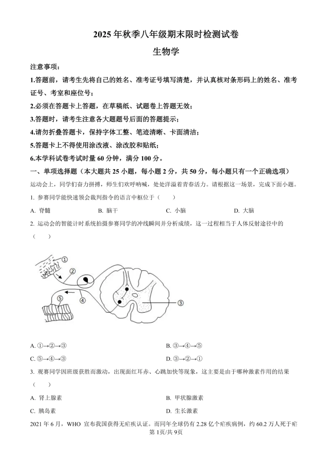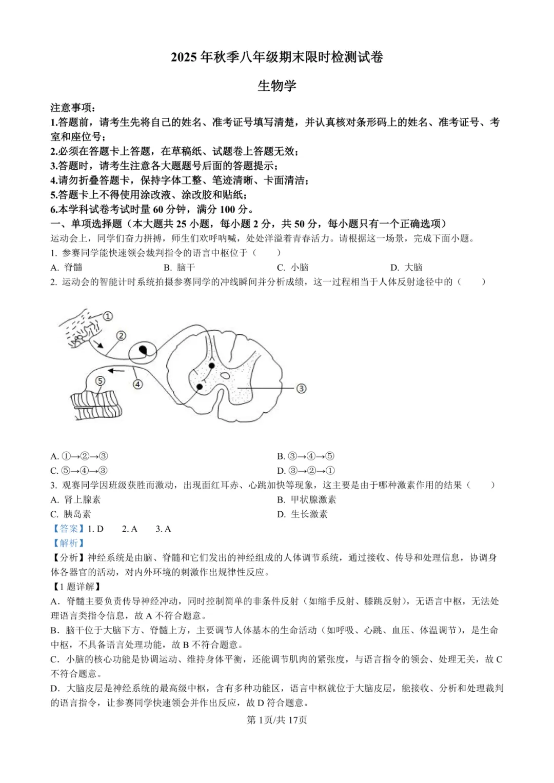 本试卷全面覆盖八年级生物学核心内容,重点考查人体生理、生态系统、遗传规律等关键知识点。得分点集中在基础概念题和图表分析题;难点在于第33题的遗传病概率计算和第28题的实验设计分析,这类题目需要学生具备较强的逻辑推理能力和综合运用知识解决问题的能力,对学生的生物学思维深度提出较高要求。