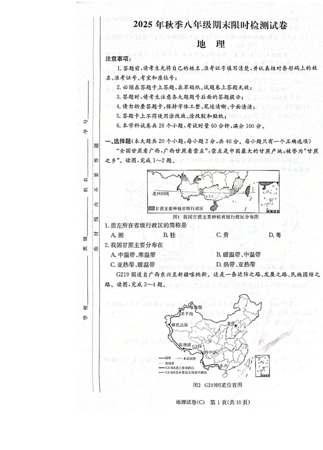 本试卷全面覆盖八年级地理核心内容,重点考查中国地理、自然资源、区域发展等关键知识点。得分点集中在基础读图题和材料分析题;难点在于第24题的水土资源匹配分析和第26题的新能源汽车产业布局,这类题目需要学生具备较强的空间思维能力和综合运用知识解决问题的能力,对学生的地理思维深度和实际应用能力提出较高要求。