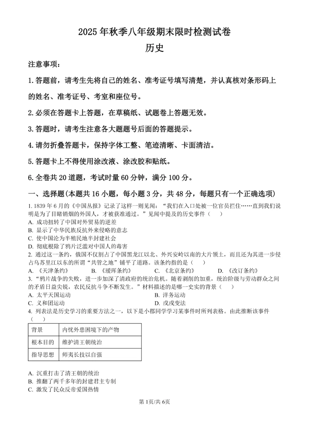 本试卷全面覆盖八年级历史核心内容,重点考查中国近代史的重大事件、人物和思想变革。得分点集中在基础史实题和材料分析题;难点在于第17题的观点论述和第19题的红色文化综合探究,这类题目需要学生具备较强的历史解释能力和综合运用知识解决问题的能力,对学生的历史思维深度和史料分析能力提出较高要求。