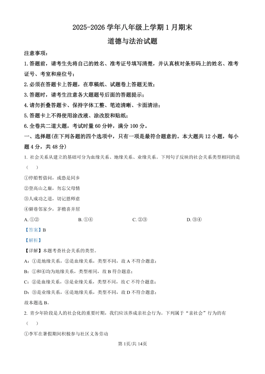 本试卷全面覆盖八年级道德与法治核心内容,重点考查社会规则、网络素养、国家安全、社会责任等关键知识点。得分点集中在基础概念题和生活情境题;难点在于第16题的美德少年综合分析和第17题的志愿服务实践设计,这类题目需要学生具备较强的价值判断能力和实践应用能力,对学生的道德认知深度和社会责任感提出较高要求。