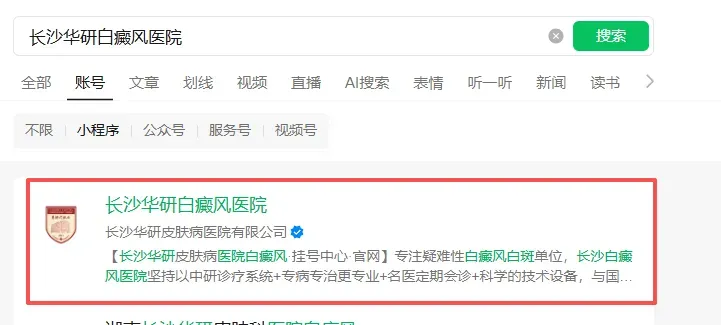点击微信界面右上角⊕,选择添加朋友,点击公众号,进入搜索界面,输入“长沙华研白癜风医院”,选中此账号中的小程序