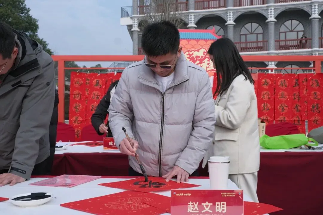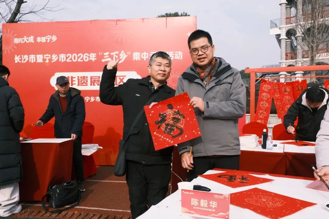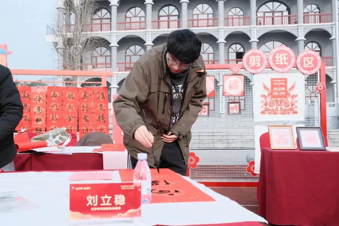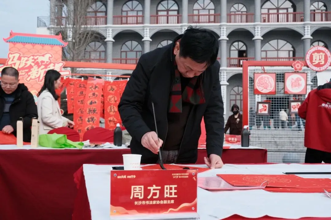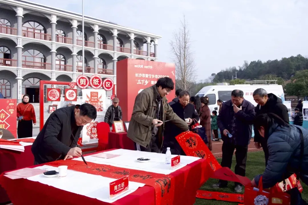 非物质文化遗产展示区年味十足,长沙市书协副主席、秘书长周方旺,长沙市书协副主席陈毅华、赵文明,中国书法家协会会员刘立稳,长沙市书协办公室主任李思全现场挥毫,将一副副翰墨飘香的“福”字与春联,连同真挚的新春祝福,亲手递到村民手中。