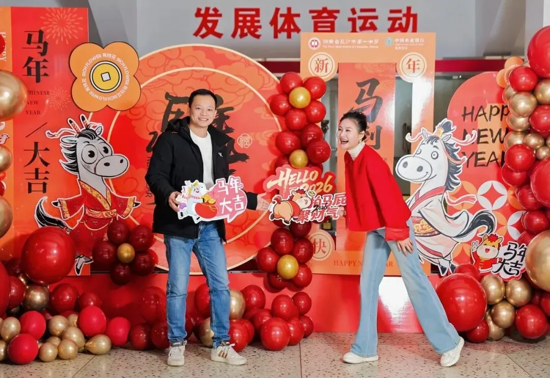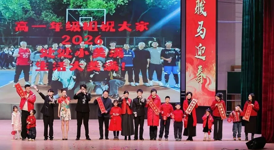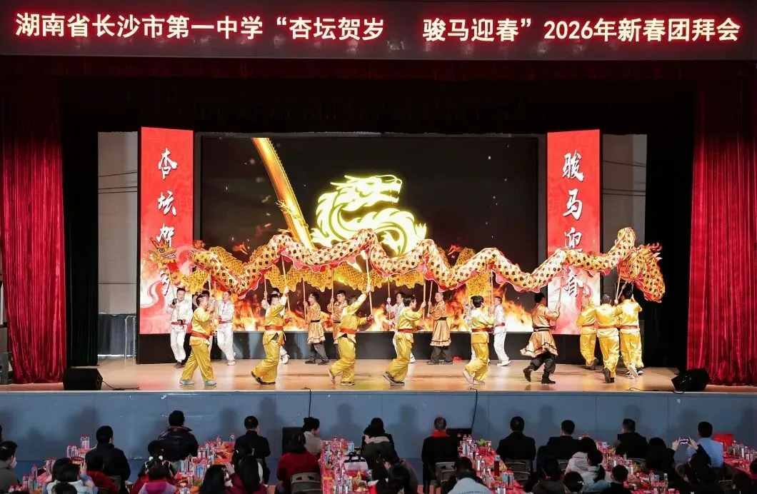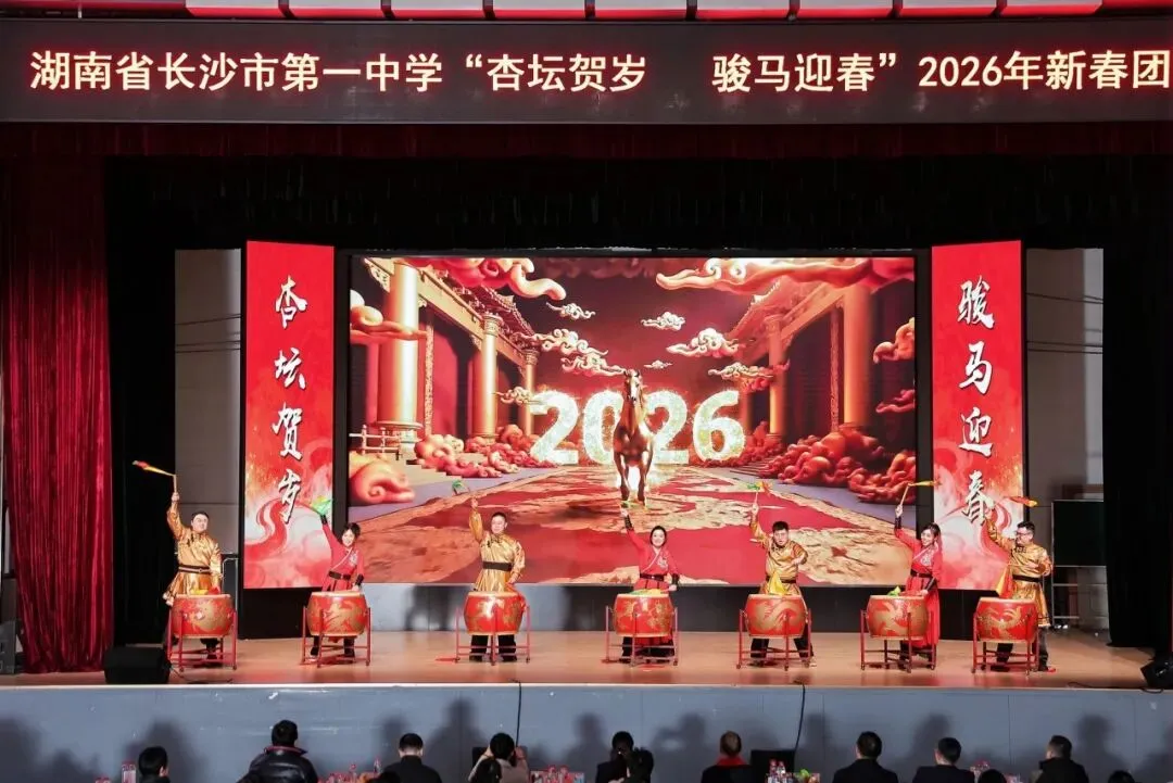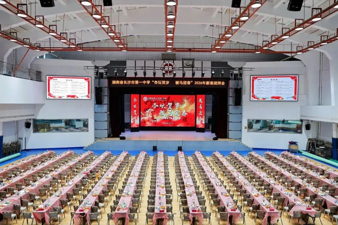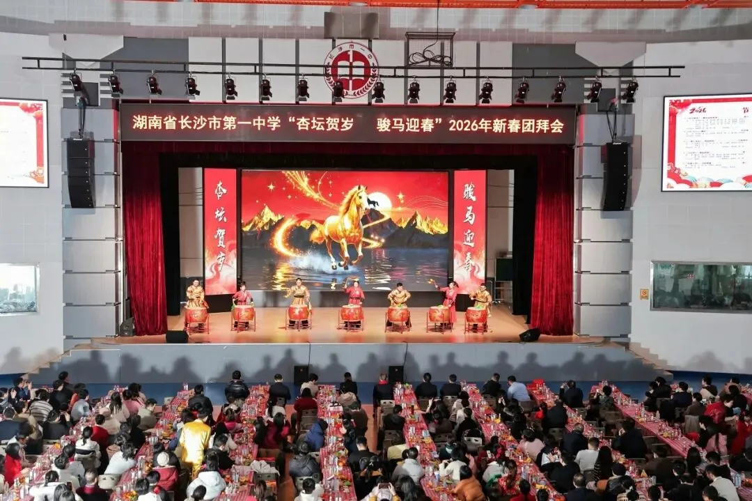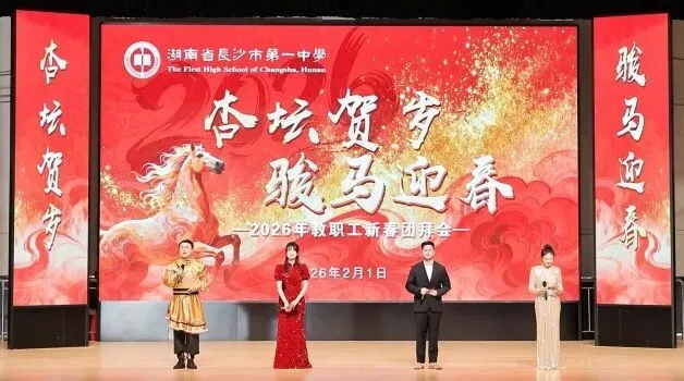 2月1日下午,长沙市一中2026年“杏坛贺岁 骏马迎春”新春团拜会在体育馆盛大举行,全体教职员工齐聚一堂,在欢声笑语中定格团圆时刻。