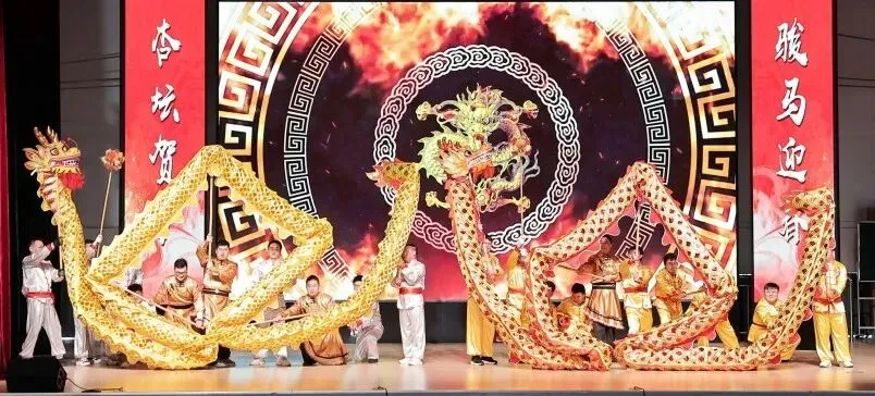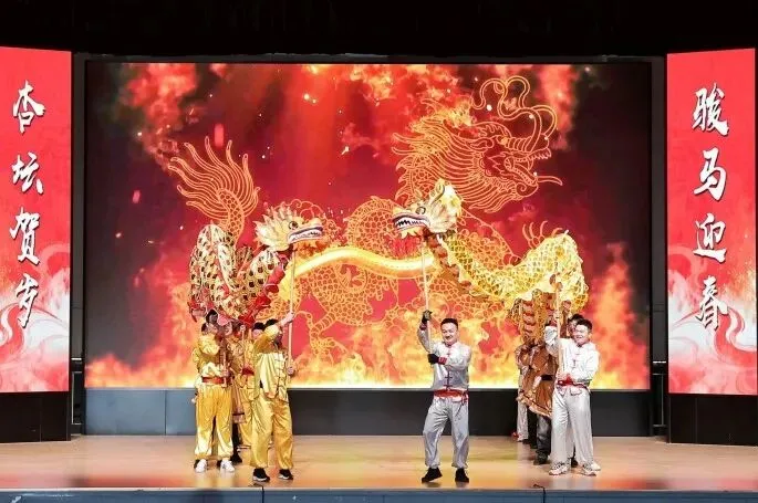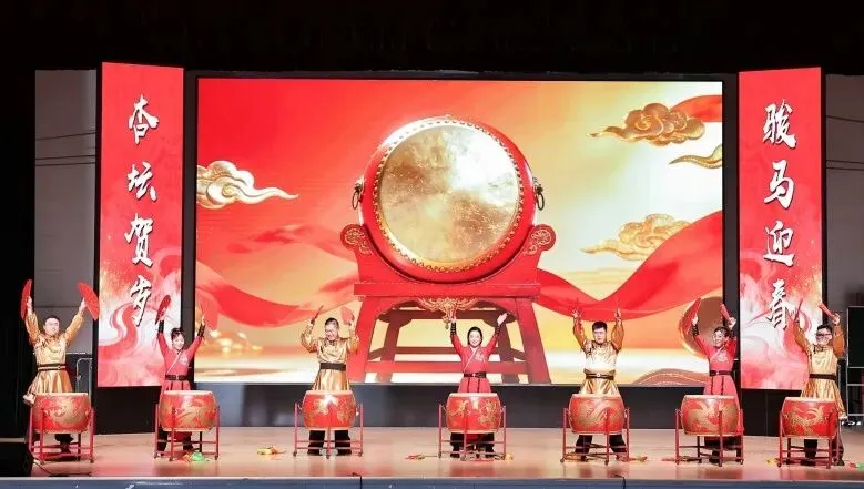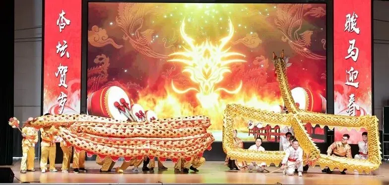 团拜会在高三年级气势恢宏的《龙马精神》舞龙击鼓表演中拉开帷幕。锣鼓铿锵震寰宇,金龙腾跃展雄风,老师们以刚劲有力的舞龙、激昂奋进的鼓点,生动诠释了一中人砥砺前行的昂扬斗志,瞬间点燃全场氛围。