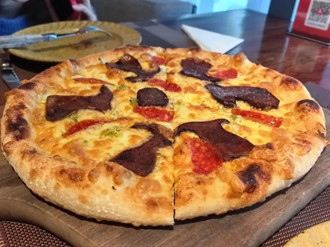 咸口披萨,牛肝菌配萨拉米香肠,芝士满满,超级拉丝。