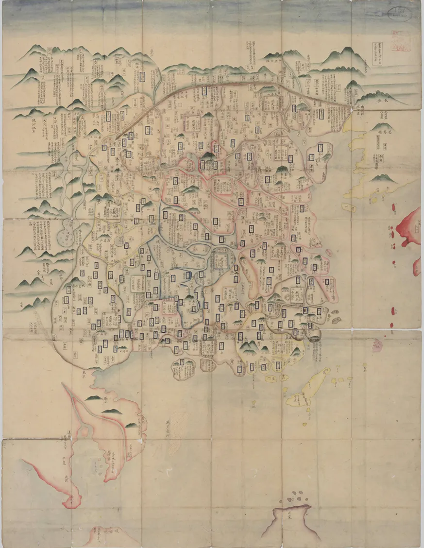 作为钞本实物,它承载着双重文化基因。舆图采用明代主流的 “计里画方” 技法,虽未明确标注比例尺,却通过方格规整疆域与政区,与罗洪先《广舆图》“每方百里” 的分省图绘制标准一脉相承。钞本的手写特质尤为鲜明,地名标注的笔锋顿挫、疆域线的细微修正,都保留了抄绘者的现场痕迹,不同于刻本的标准化呈现,更具史料原生性。图首未署绘制者与抄录者姓名,但内藤文库的收藏印记揭示了其流传脉络 —— 这部钞本应是江户时代汉学家辗转搜集的中国舆图抄本,后被内藤湖南纳入珍藏,成为日本汉学界研究中国历史地理的重要文献。