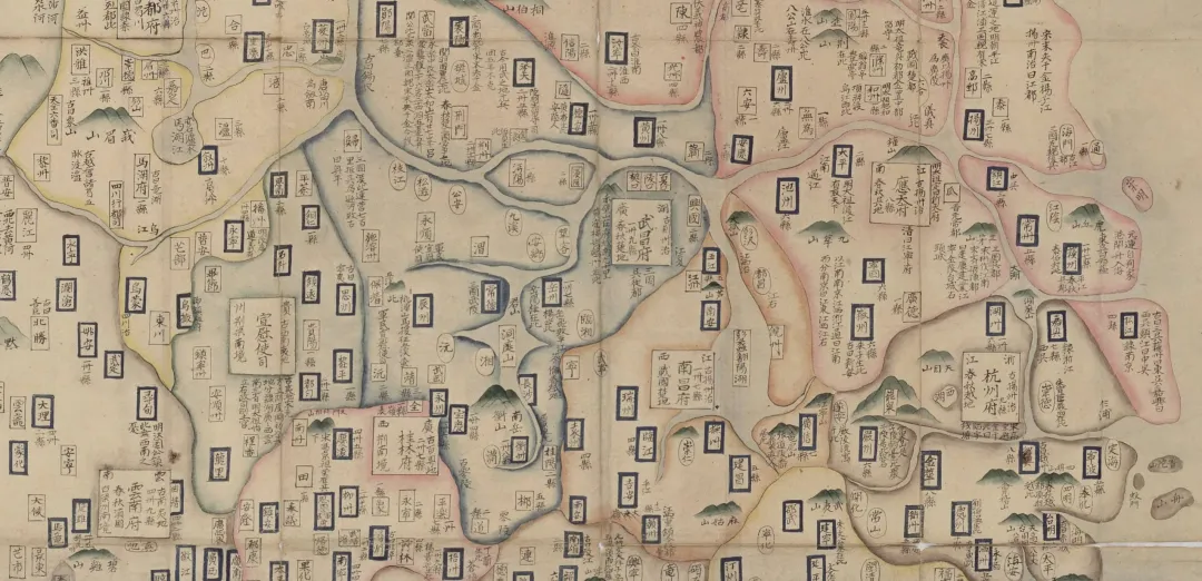 这部钞本的技术内核,是对明代《广舆图》制图体系的完整继承。它沿用 “计里画方” 的核心方法,以方格规整地理要素,确保了疆域与政区的比例相对准确,这一技法经《广舆图》普及后,成为明代舆图的标志性特征。符号系统也与《广舆图》高度契合:河流用双曲线表示,山脉以青绿晕染,府州县治以不同形状的符号区分,初步形成了标准化的地理表达,比元代舆图更为规范。