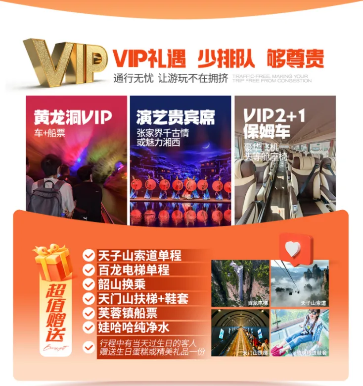 特别提示:如张家界VlP旅行车资源紧张不够用,则更改为常规旅行车(保证25%空坐率)请理解