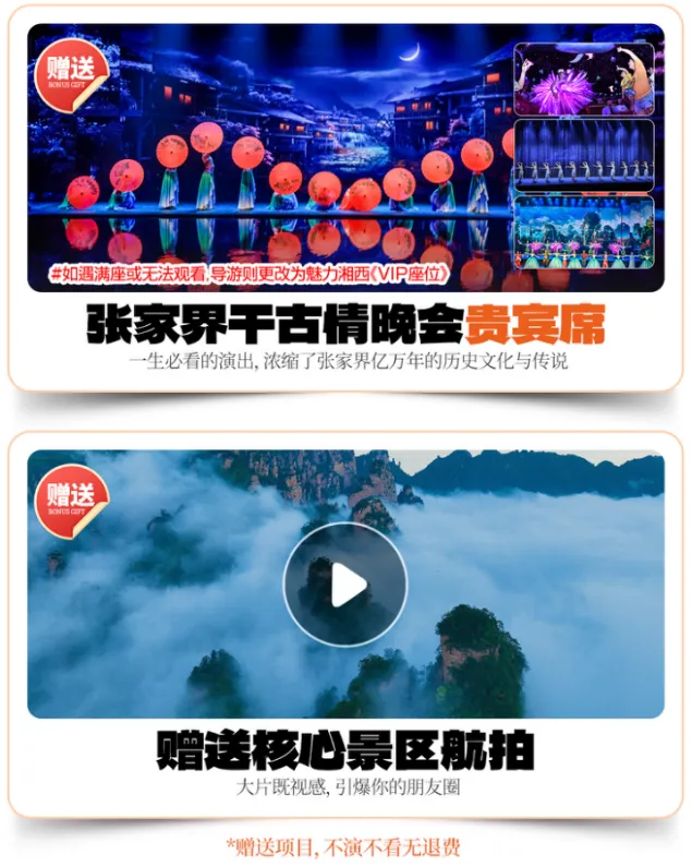 3、如遇张家界千古情晚会座满则更改为魅力湘西VIP座位(无差价可退)