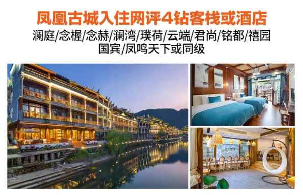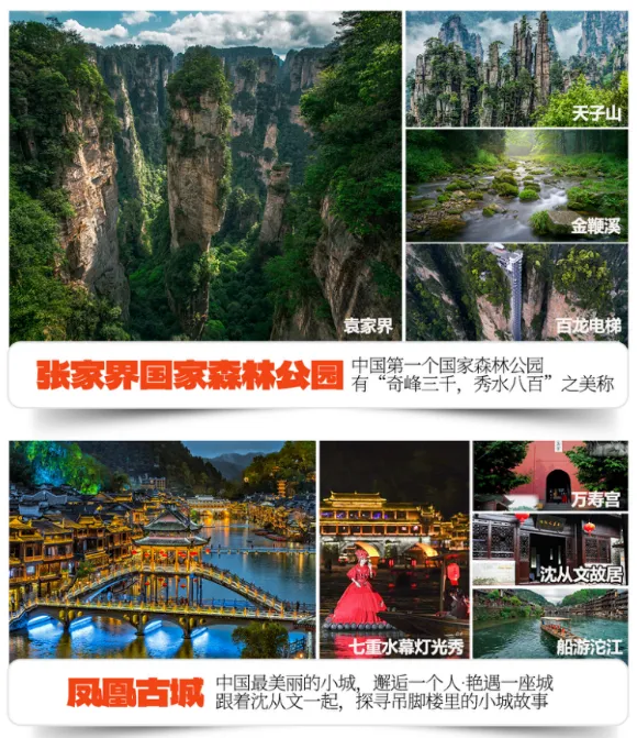 今日可早出发欣赏【凤凰晨景】,前往(沈从文故居)沈从文原名沈岳焕,是我国著名的文学家、历史学家、文物专家。被誉为世界乡土文学之父。他不仅是中华民族的骄傲,更是凤凰人民的骄傲。他的一生所创作的500多万字的作品,是世界的文学瑰宝,也给后人研究中国和湘西留下了宝贵的历史文献,(船游沱江)沱江河是凤凰古城的母亲河,她依着城墙缓缓流淌,世世代代哺育着古城儿女。坐上乌蓬船,听着艄公的号子,看着两岸已有百年历史的土家吊脚楼,别有一番韵味。顺水而下,穿过虹桥一幅江南水乡的画卷便展现于眼前,依船靠岸,走上台阶【万寿宫】你会看到一座雄伟的会馆,她设计精巧独特,雕琢玲珑剔透,或飞檐翘角,或回廊游转,或卧龙啸空,或奇兽驰骋,可以说是点雨楼台荟萃的建筑艺术大观。尔后可逛网红打卡地翠翠街(苗家人谈情说爱的地方),还原翠翠的故事,让您身临其境的感受沈从文的边城。中餐后前往游览挂在瀑布上的千年古镇——【芙蓉镇】(赠送景区交通车/船票),游览王者之村,感受帝王风范,此处曾经是土司王休闲度假之地,1986年拍摄电影《芙蓉镇》而得名。BUS张家界,赴有“世界溶洞全能冠军”之称的【黄龙洞VIP绿色通道】标志性景点(定海神针)是最高的一根石笋,被投保一个亿。黄龙洞内洞中有洞,洞中有河,洞穴奇观,琳琅满目,仿若神奇地下魔宫,被誉为“中国最美的旅游溶洞”、世界溶洞的“全能冠军”。(乘地下河游船)奇幻浪漫---黄龙洞响水河。响水河全长2820米,是黄龙洞里的一条地下阴河,平均水深6米,最深处有12米,水温常年保持在16摄氏度左右,是国家一级保护动物娃娃鱼的理想生存环境。