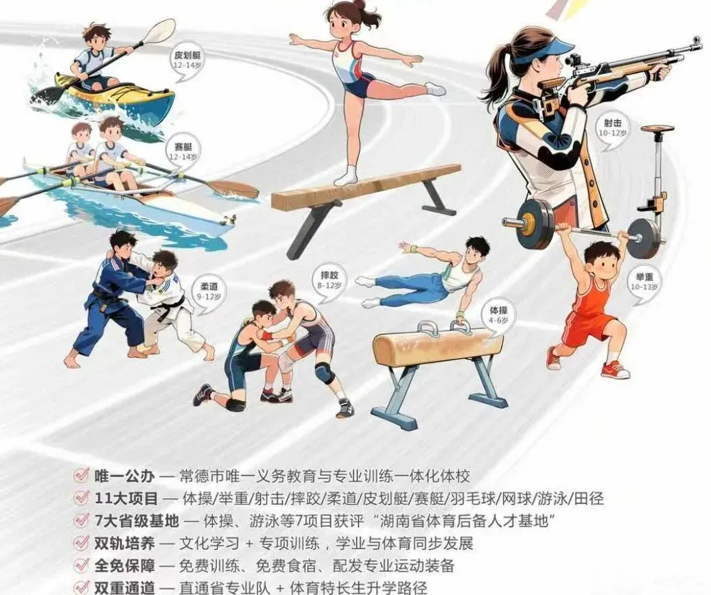 常德市体育运动学校是常德市唯一一所集义务教育与专业训练于一体的公办体育运动学校,被国家体育总局授予“国家重点高水平体育后备人才基地”称号。学校核心职能为选拔、培养、输送优秀体育后备人才,组队代表常德市参加省级及以上重大体育赛事。现开设体操、举重、射击、摔跤、柔道、皮划艇、赛艇、羽毛球、网球、游泳、田径11个运动项目,其中体操、游泳、射击、摔跤、柔道、皮划艇、赛艇7个项目先后获评“湖南省体育后备人才基地”。训练体系完善,师资力量雄厚。(一)招生范围