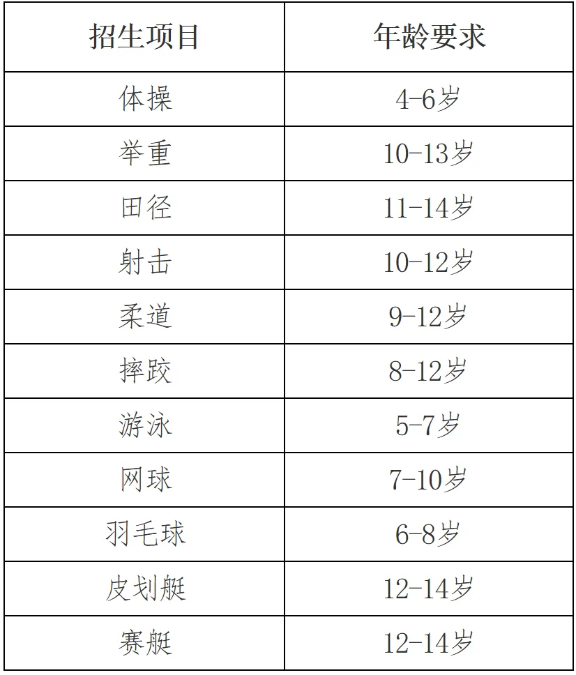 2.特别说明:对天赋异禀、专项能力突出的体育苗子,不受报名时间限制,可随时联系学校申请选拔和试训。(二)招生项目及年龄要求