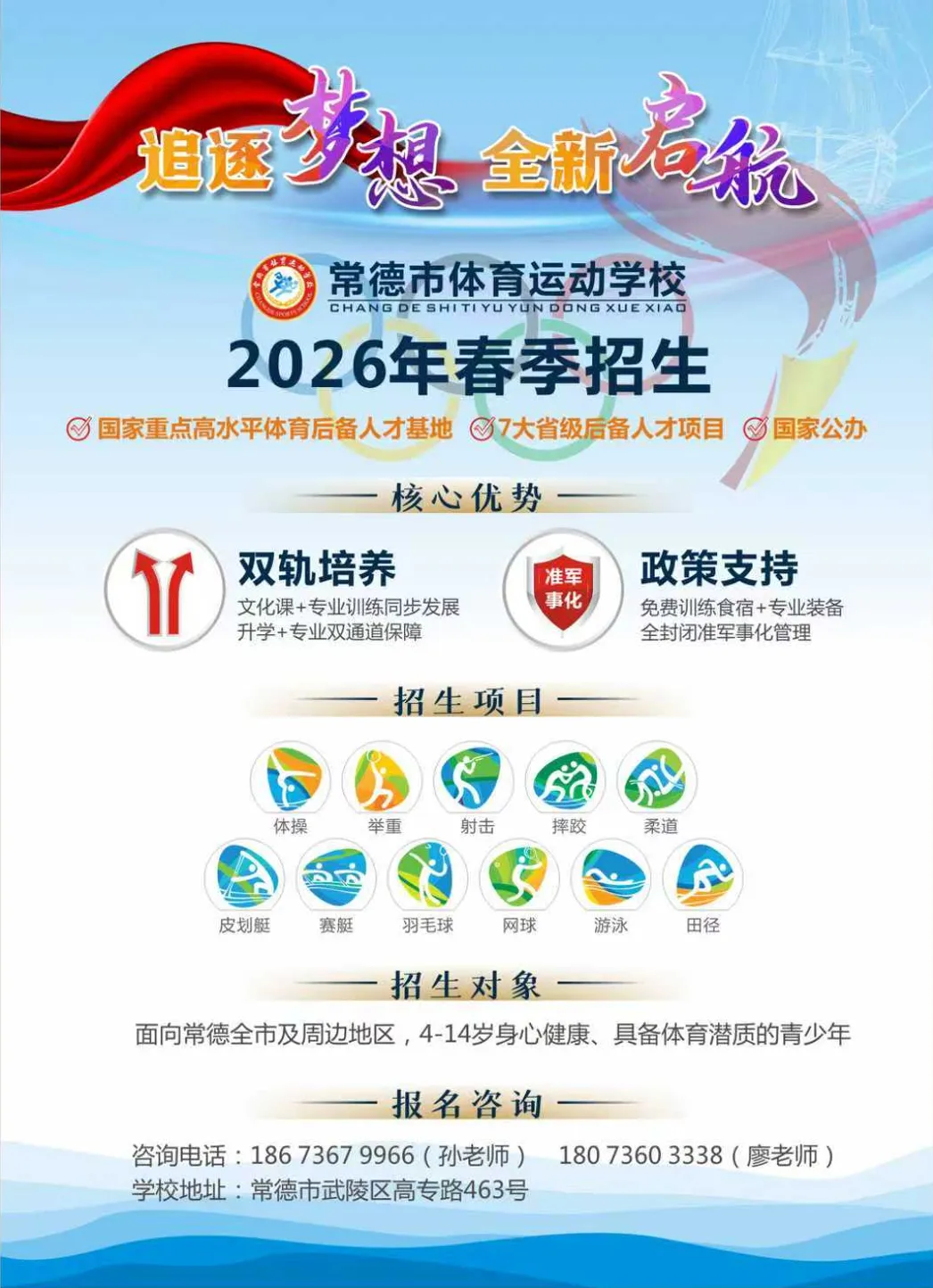 面向常德全市及周边地区,招收符合各运动项目年龄要求、具备体育发展潜质的适龄青少年。(二)招生条件
