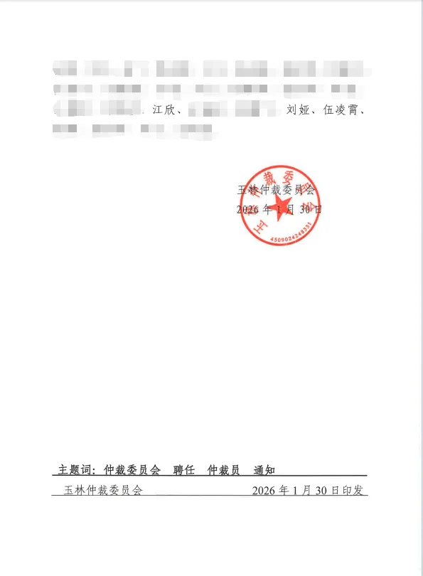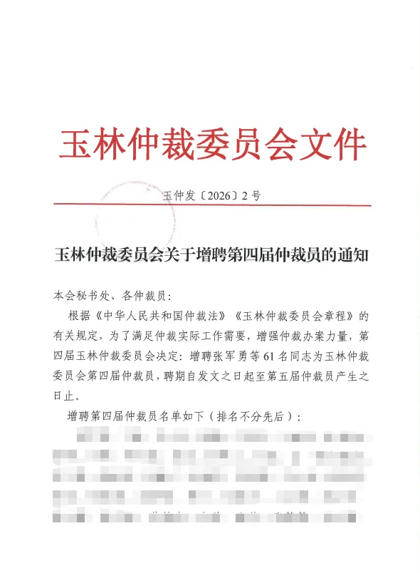 近日,为满足仲裁实际工作需要,增强仲裁办案力量,第四届玉林仲裁委员会增聘61名同志为玉林仲裁委员会第四届仲裁员。兰台长沙办公室执行主任、高级合伙人江欣律师;高级合伙人刘娅律师;合伙人伍凌霄律师增聘为仲裁员。